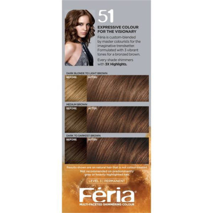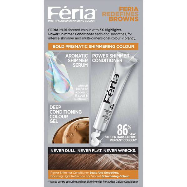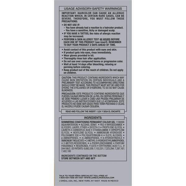 About This Item We aim to show you accurate product information. Manufacturers, suppliers and others provide what you see here, and we have not verified it. See our disclaimer With L'Oreal Feria, what you see is the shimmer. Multi-Faceted shimmering color with 3X highlights delivers intensified, brilliant results. Inspired by fashion, Feria offers a twist on the traditional and gives edgy hair color - from bright red, platinum blonde, rose gold, metallic brown, to blue black hair color, these hair dye kits will transform your hair. Feria's prismatic color spectrum is custom-blended by L'Oreal master colorists for bold, head-turning shades – no appointment necessary. The Power Shimmer Conditioner seals and smooths. Won't wreck or ravage hair. Packaging may vary, what you receive may not be what is reflected on site. L’Oreal Paris Feria Multi-Faceted Shimmering Color with 3X the highlights delivers intensified, brilliant results Never leaves hair dull or flat Seals and smooths hair, never wrecks or ravages hair Delivers trendy, edgy, shimmering, fashionable and multi-tonal hair colors