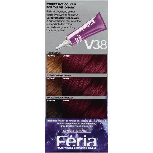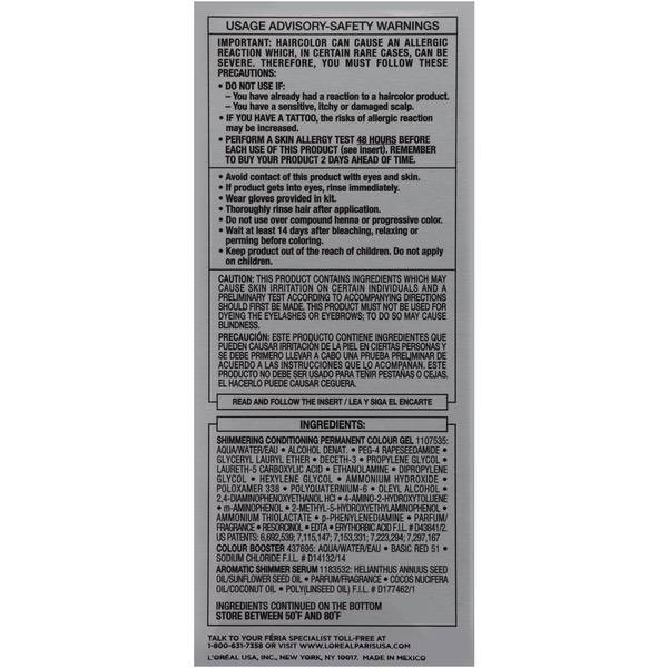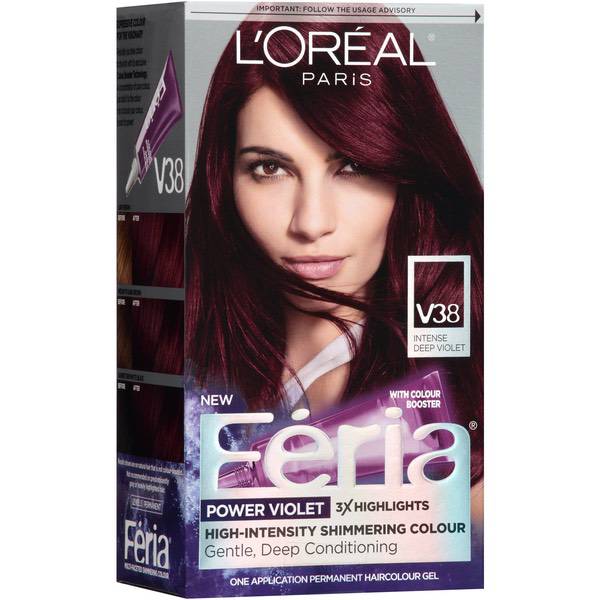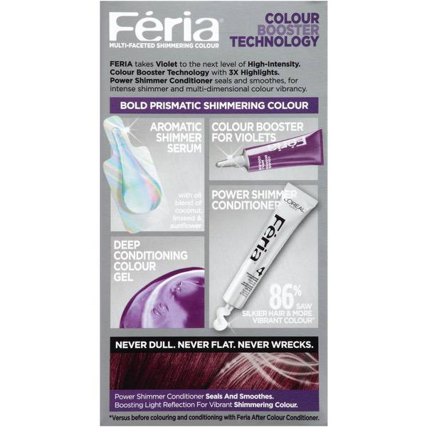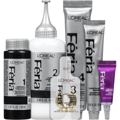 About This Item    We aim to show you accurate product information.   Manufacturers, suppliers and others provide what you see here, and we have not verified it.   See our disclaimer         L'Oréal® Paris Feria® Permanent Hair Color    With L'Oreal Feria, what you see is the shimmer. Multi-Faceted shimmering color with 3X highlights delivers intensified, brilliant results. Inspired by fashion, Feria offers a twist on the traditional and gives edgy hair color - from bright red, platinum blonde, rose gold, metallic brown, to blue black hair color, these hair dye kits will transform your hair. Feria's prismatic color spectrum is custom-blended by L'Oreal master colorists for bold, head-turning shades – no appointment necessary. The Power Shimmer Conditioner seals and smooths. Won't wreck or ravage hair.        Multi-Faceted Shimmering Color   Never dull or flat   Never wrecks or ravages   Pure Dyes