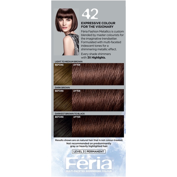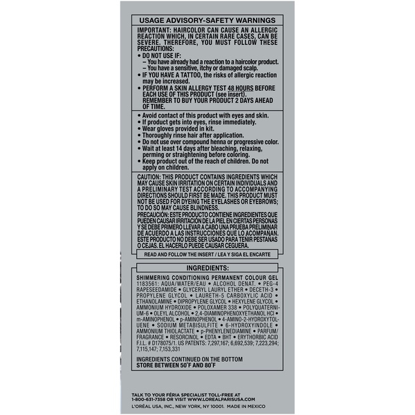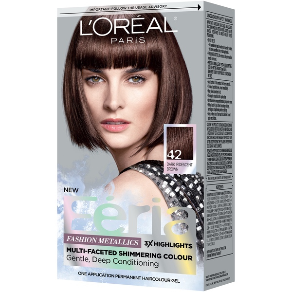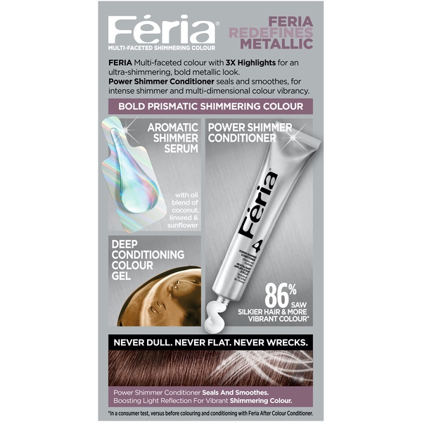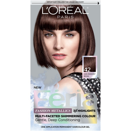 About This Item We aim to show you accurate product information. Manufacturers, suppliers and others provide what you see here, and we have not verified it. See our disclaimer L'Oreal Paris Feria Permanent Hair Color With L'Oreal Feria, what you see is the shimmer. Multi-Faceted shimmering color with 3X highlights delivers intensified, brilliant results. Inspired by fashion, Feria offers a twist on the traditional and gives edgy hair color - from bright red, platinum blonde, rose gold, metallic brown, to blue black hair color, these hair dye kits will transform your hair. Feria's prismatic color spectrum is custom-blended by L'Oreal master colorists for bold, head-turning shades - no appointment necessary. The Power Shimmer Conditioner seals and smooths. Won't wreck or ravage hair. Multi-Faceted Shimmering Color Never dull or flat Never wrecks or ravages Pure Dyes
