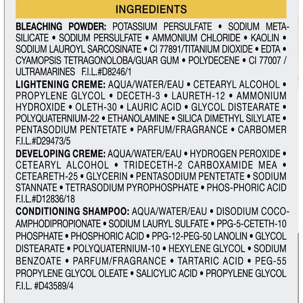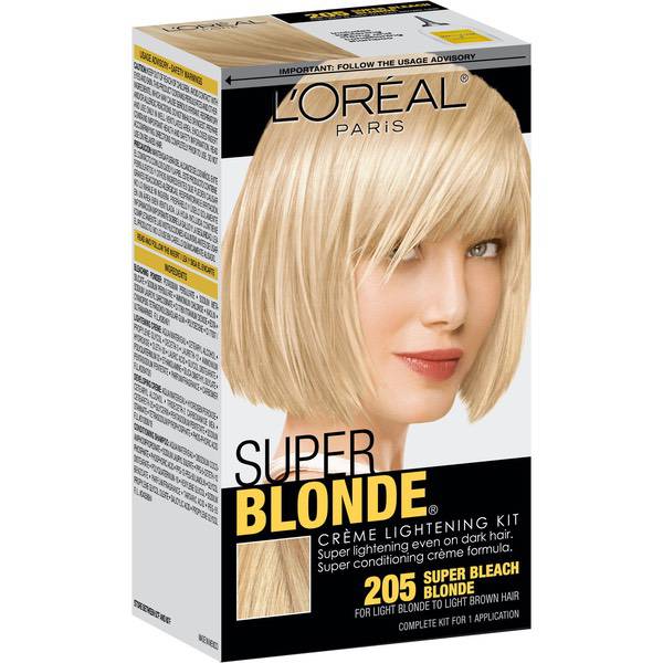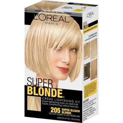 About This Item We aim to show you accurate product information. Manufacturers, suppliers and others provide what you see here, and we have not verified it. See our disclaimer This L'Oreal Paris Super Blonde Creme Lightening Kit, Super Bleach Blonde 205, is designed with an advanced lightening formula, It lifts your hair color for an ultra-luminous blonde result. It is specially made for those who desire super-lightening action from root to tip. The hair lightening kit changes natural or color-treated hair with ease, so you can use it no matter your hair type. It is even effective on dark hair. The hair-lightening creme has a luxurious, non-drip formula that delivers smooth, even blonding for an ultra-light result. It takes even dark hair to a pure, shining result in one simple step. The super-rich ingredients protect and condition hair as you lift the color too, giving you the healthy look that you want. The conditioning shampoo leaves your hair soft, manageable and luminous after you lighten. The kit comes with the essentials that you need to create the lighter hair look that you want. This hair-lightening kit is easy to use, so you can have effective results quickly. The special blend of ingredients is designed to permanently lighten your hair. Let the L'Oreal Paris Super Blonde Creme Lightening Kit, Super Bleach Blonde 205 give you the stylish look you want. L'Oreal Paris Super Blonde Creme Lightening Kit, Super Bleach Blonde 205: 205 Super Bleach Blonde for light blonde to dark brown hair Use hair-lightening kit 200 bleach blonde for medium brown to dark brown hair L'Oreal Paris Super Blonde Creme Lightening kit includes: lightening creme, developing creme, bleaching powder, conditioning shampoo, applicator tip, instruction brochure and salon gloves