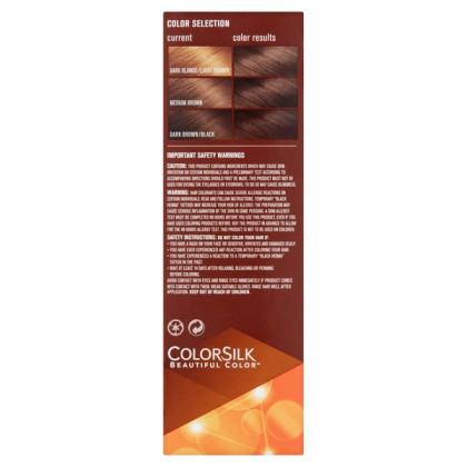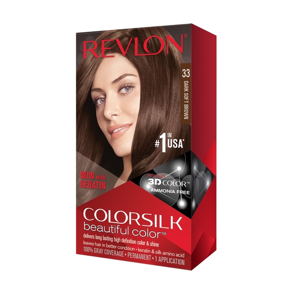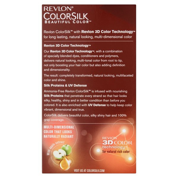 About This Item We aim to show you accurate product information. Manufacturers, suppliers and others provide what you see here, and we have not verified it. See our disclaimer Achieve natural-looking, multitonal color This specially blended, permanent hair color formula includes our Revlon 3D Color Gel Technology™, which deposits rich, dimensional color that looks natural and lasts You get 100% gray coverage from ColorSilk Beautiful Color™—that’s our promise UV Defense helps shield color against fading, keeping your shade bright and true Our formula, with nourishing silk proteins, leaves your hair in better condition than before you colored (sweet!). Ammonia-free—and now with keratin added to the formula Available in 41 shades