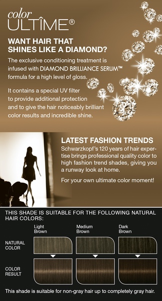 About This Item We aim to show you accurate product information. Manufacturers, suppliers and others provide what you see here, and we have not verified it. See our disclaimer Experience sublime care for your hair formulated with Intensive Care Elixir with pearl essence. For shiny hair luxuriously soft to touch, hair dye available in vibrant colors in these high definition shades: Deep Brunettes, Iconic Blondes, Luminous Blacks, Flaming Reds, and Glowing Coppers. INTENSE COLOR: The breakthrough formula of Color Ultime hair colorations provide vivid color intensity and premium performance for noticeably brilliant color results. FADE RESISTANT: The advanced, premium formula of Color Ultime hair dye defies fading for lasting vibrancy for up to 9 weeks! SHINE LIKE A DIAMOND: Color Ultime hair colorations provide lasting, incredible shine that is sure to stop the show! IN THE BOX: 1 tube color cream, 1 application bottle with developer lotion, 1 tube conditioning treatment, 1 pair of gloves, and 1 instruction leaflet If your hair is longer than shoulder length, we recommend using 2 boxes of Color Ultime hair dye for the application.