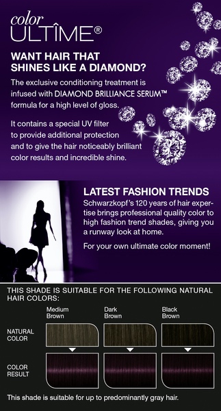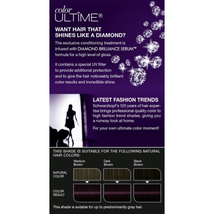 About This Item We aim to show you accurate product information. Manufacturers, suppliers and others provide what you see here, and we have not verified it. See our disclaimer Experience sublime care for your hair formulated with Intensive Care Elixir with pearl essence. For shiny hair luxuriously soft to touch, hair dye available in vibrant colors in these high definition shades: Deep Brunettes, Iconic Blondes, Luminous Blacks, Flaming Reds, and Glowing Coppers. INTENSE COLOR: The breakthrough formula of Color Ultime hair colorations provide vivid color intensity and premium performance for noticeably brilliant color results. FADE RESISTANT: The advanced, premium formula of Color Ultime hair dye defies fading for lasting vibrancy for up to 9 weeks! SHINE LIKE A DIAMOND: Color Ultime hair colorations provide lasting, incredible shine that is sure to stop the show! IN THE BOX: 1 tube color cream, 1 application bottle with developer lotion, 1 tube conditioning treatment, 1 pair of gloves, and 1 instruction leaflet If your hair is longer than shoulder length, we recommend using 2 boxes of Color Ultime hair dye for the application.