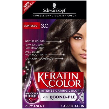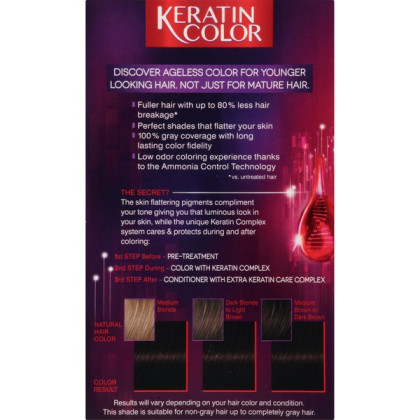 About This Item We aim to show you accurate product information. Manufacturers, suppliers and others provide what you see here, and we have not verified it. See our disclaimer Keratin color uses Unique Collagen Care Complex and Skin Flattering Pigments to deliver intense hair dye color and fuller looking hair in just 30 minutes! Keratin Coloration acts as a treatment to help repair highly processed, damaged hair with up to 80% less hair breakage*. 20 intensive hair dye colors deliver 100% gray coverage with a low-odor coloring experience thanks to the Ammonia Control Technology. OUR MOST CARING COLOR: The skin flattering pigments complement your tone giving you that luminous look in your skin, while the unique Keratin Complex system cares and protects during and after coloring. LOW ODOR TECHNOLOGY: Low odor coloring experience thanks to the Ammonia Control Technology. SKIN FLATTERING PIGMENTS: Perfect shades that flatter your skin for an all-over beautiful look. 100% GRAY COVERAGE: Gray coverage with long lasting color fidelity giving you fuller hair with up to 80% less hair breakage* (*vs. untreated hair). If your hair is longer than shoulder length, we recommend using 2 boxes of Keratin Color hair dye for the application.