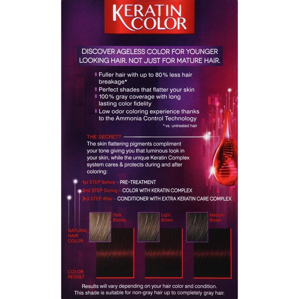 About This Item We aim to show you accurate product information. Manufacturers, suppliers and others provide what you see here, and we have not verified it. See our disclaimer Keratin color uses Unique Collagen Care Complex and Skin Flattering Pigments to deliver intense hair dye color and fuller looking hair in just 30 minutes! Keratin Coloration acts as a treatment to help repair highly processed, damaged hair with up to 80% less hair breakage*. 20 intensive hair dye colors deliver 100% gray coverage with a low-odor coloring experience thanks to the Ammonia Control Technology. OUR MOST CARING COLOR: The skin flattering pigments complement your tone giving you that luminous look in your skin, while the unique Keratin Complex system cares and protects during and after coloring. LOW ODOR TECHNOLOGY: Low odor coloring experience thanks to the Ammonia Control Technology SKIN FLATTERING PIGMENTS: Perfect shades that flatter your skin for an all-over beautiful look. 100% GRAY COVERAGE: Gray coverage with long lasting color fidelity giving you fuller hair with up to 80% less hair breakage* (*vs. untreated hair). If your hair is longer than shoulder length, we recommend using 2 boxes of Keratin Color hair dye for the application.