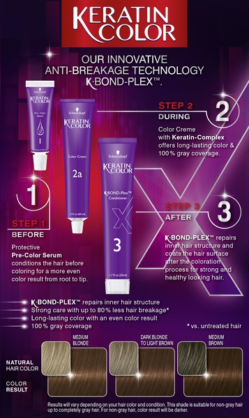 About This Item We aim to show you accurate product information. Manufacturers, suppliers and others provide what you see here, and we have not verified it. See our disclaimer Keratin color uses Unique Collagen Care Complex and Skin Flattering Pigments to deliver intense hair dye color and fuller looking hair in just 30 minutes! Keratin Coloration acts as a treatment to help repair highly processed, damaged hair with up to 80% less hair breakage*. 20 intensive hair dye colors deliver 100% gray coverage with a low-odor coloring experience thanks to the Ammonia Control Technology. OUR MOST CARING COLOR: The skin flattering pigments complement your tone giving you that luminous look in your skin, while the unique Keratin Complex system cares and protects during and after coloring. LOW ODOR TECHNOLOGY: Low odor coloring experience thanks to the Ammonia Control Technology SKIN FLATTERING PIGMENTS: Perfect shades that flatter your skin for an all-over beautiful look. 100% GRAY COVERAGE: Gray coverage with long lasting color fidelity giving you fuller hair with up to 80% less hair breakage* (*vs. untreated hair). If your hair is longer than shoulder length, we recommend using 2 boxes of Keratin Color hair dye for the application.