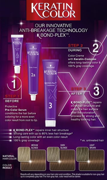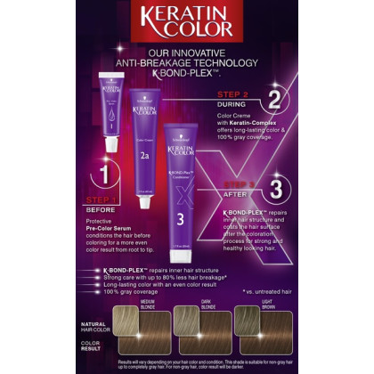 About This Item We aim to show you accurate product information. Manufacturers, suppliers and others provide what you see here, and we have not verified it. See our disclaimer Keratin color uses Unique Collagen Care Complex and Skin Flattering Pigments to deliver intense hair dye color and fuller looking hair in just 30 minutes! Keratin Coloration acts as a treatment to help repair highly processed, damaged hair with up to 80% less hair breakage*. 20 intensive hair dye colors deliver 100% gray coverage with a low-odor coloring experience thanks to the Ammonia Control Technology. OUR MOST CARING COLOR: The skin flattering pigments complement your tone giving you that luminous look in your skin, while the unique Keratin Complex system cares and protects during and after coloring. LOW ODOR TECHNOLOGY: Low odor coloring experience thanks to the Ammonia Control Technology SKIN FLATTERING PIGMENTS: Perfect shades that flatter your skin for an all-over beautiful look. 100% GRAY COVERAGE: Gray coverage with long lasting color fidelity giving you fuller hair with up to 80% less hair breakage* (*vs. untreated hair). If your hair is longer than shoulder length, we recommend using 2 boxes of Keratin Color hair dye for the application.