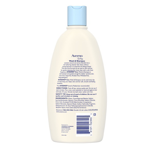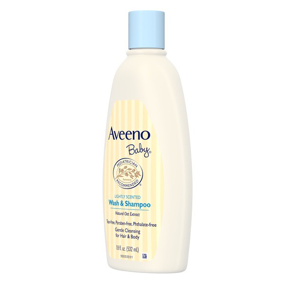 About This Item    We aim to show you accurate product information.   Manufacturers, suppliers and others provide what you see here, and we have not verified it.   See our disclaimer       Gently cleanse your baby's skin and hair with Aveeno Baby Wash & Shampoo, which features a gentle formula that gently cleanses without drying. For babies with sensitive skin, this tear-free formula gently cleanses without drying. Pediatrician-recommended, the formula contains natural oat extract, which is known to soothe and gently nourish delicate skin. The rich lathering formula rinses clean, leaving a light, fresh fragrance. This combination baby wash and shampoo is soap-free, hypoallergenic, and safe for daily use.    18-fl. oz bottle of gentle Aveeno baby wash and shampoo   Formulated with natural oat extract which is known to soothe and gently nourish delicate skin   Rich lathering wash & shampoo formula rinses clean & leaves a light, fresh fragrance   Gentle and tear-free formula cleanses without drying   Shampoo & wash from Aveeno, a pediatrician recommended brand for 60 years   The combination baby wash and shampoo is soap-free, hypoallergenic, and tear-free   Formulates to be gentle enough for babies' sensitive skin   Use this baby wash & shampoo every day to keep baby's skin & hair feeling soft and smooth