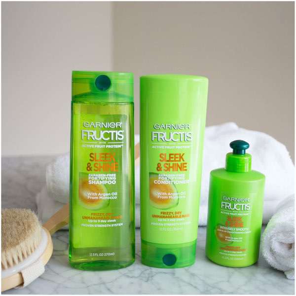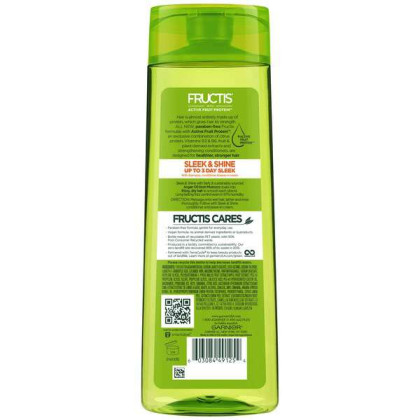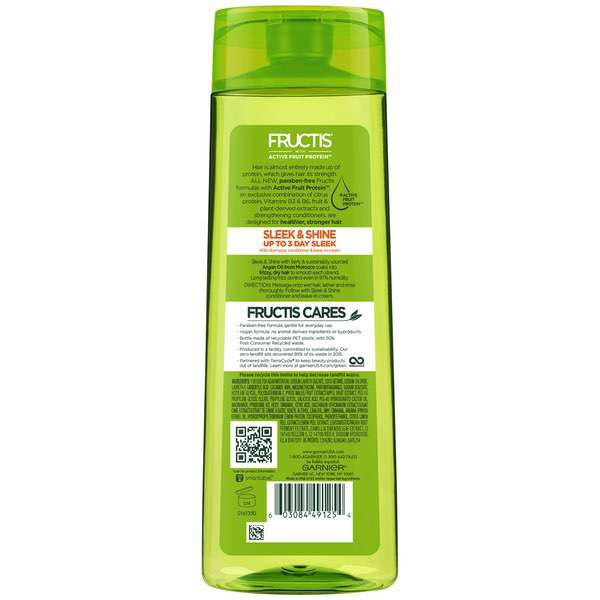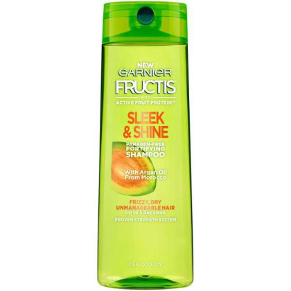 About This Item We aim to show you accurate product information. Manufacturers, suppliers and others provide what you see here, and we have not verified it. See our disclaimer Garnier® Fructis® Sleek & Shine Shampoo 22 FL OZ Hair is almost entirely made up of protein, which gives hair its strength. Paraben-free Fructis formulas with Active Fruit Protein™, an exclusive combination of citrus protein, Vitamins B3 & B6, fruit & plant-derived extracts and strengthening conditioners, are designed for healthier, stronger hair. Fructis Sleek & Shine Shampoo with fairly & sustainably sourced Argan Oil from Morocco soaks into frizzy, dry hair to smooth each strand. Long lasting frizz control even in 97% humidity*. *With shampoo, conditioner & leave-in cream. Get up to 3 day sleek with Sleek and Shine system of shampoo, conditioner and leave-in cream System provides long lasting frizz control even in 97 percent humidity Fortifying shampoo with fairly and sustainably sourced Argan Oil from Morocco Soaks into frizzy, dry hair to smooth each strand
