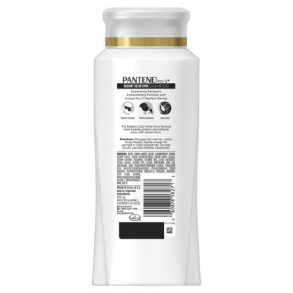 About This Item We aim to show you accurate product information. Manufacturers, suppliers and others provide what you see here, and we have not verified it. See our disclaimer Get up to 6 weeks of brilliant color* with Radiant Color Shine Shampoo. The powerful Pro-V formula wraps every strand as it gently cleanses, adds moisture and gives hair brilliant shine. With Pantene Pro-V Radiant Color Shine, youll get lasting color* and your hair will feel healthy as its hydrated from root to tip. *Radiant Color Shine shampoo and conditioner system vs. non-conditioning shampoo. Pantene Pro-V Radiant Color Shine Shampoo, 25 fl oz: Radiant Color Shine Shampoo nourishes hair with a blend of Pro-V nutrients and antioxidants so hair is strong against damage Delivers up to 6 weeks of brilliant color* (*Radiant Color Shine shampoo and conditioner system vs. non-conditioning shampoo) Luxurious formula made for color-treated hair with a nutrient-rich lather that wraps every strand for all-day lasting shine Powerful Pro-V formula hydrates and nourishes for natural shine and touchably soft hair Brings shine to color-treated hair