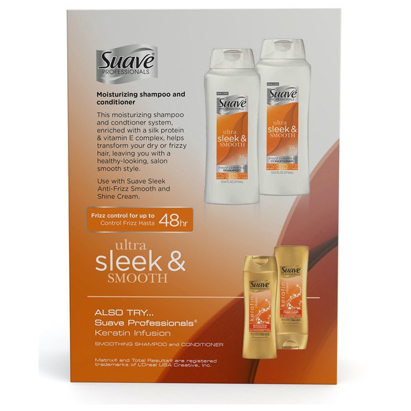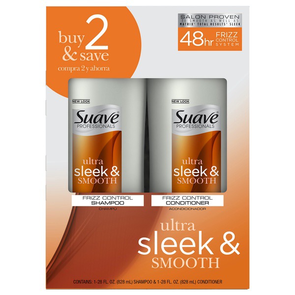 About This Item We aim to show you accurate product information. Manufacturers, suppliers and others provide what you see here, and we have not verified it. See our disclaimer Suave Professionals Sleek and Smooth Shampoo and Conditioner system transforms your dry or frizzy hair into a healthy-looking, salon-smooth style. Suave Professionals Sleek and Smooth shampoo and conditioner system is salon proven to smooth as well as Matrix Total Results Mega Sleek. Suave Professionals anti frizz formula is enriched with a silk protein and vitamin E complex to soften and improve hair's overall texture. The system helps deliver frizz control for up to 48 hours. For stunningly sleek hair, massage shampoo into hair. Lather and rinse. Follow with Suave Professionals Smooth and Sleek Conditioner for best results. For easy styling, try our Suave Professionals Sleek Anti Frizz Smooth & Shine Cream for all day frizz control & shine. Achieve Salon-Quality Results Suave Professionals is salon-proven to work as well as salon brands, helping you achieve a variety of beautiful hairstyles while caring for your hair. This line is developed to help you achieve naturally gorgeous, healthy-looking locks. About Suave For over 75 years Suave has offered professional quality products for the entire family, which are proven to work as well as salon brands. The Suave mission is to make gold standard quality attainable to all, so everyone can look good, smell good, and feel good every day. Matrix Total Results Mega Sleek is a registered trademark of L'Oreal. Suave Professionals Smooth and Sleek for Dry Hair, Anti Frizz Shampoo and Conditioner, 28 oz, 2 count Suave Professionals Smooth and Sleek Shampoo and Conditioner soften and improve hair's overall texture Salon-proven to smooth as well as Matrix Total Results Mega Sleek (Matrix and Total Results are registered trademarks of L'Oreal USA Creative, Inc. Mega Sleek is a registered trademark of L'Oreal SA.) Anti frizz hair products enriched with a silk protein and vitamin E complex Shampoo & conditioner system helps deliver frizz control for up to 48 hours Use with Suave Professionals Sleek and Smooth Shampoo and Conditioner together for healthy-looking, salon-smooth style Suave Professionals Sleek Shampoo and Conditioner works for dry or frizzy hair