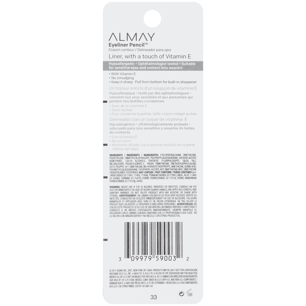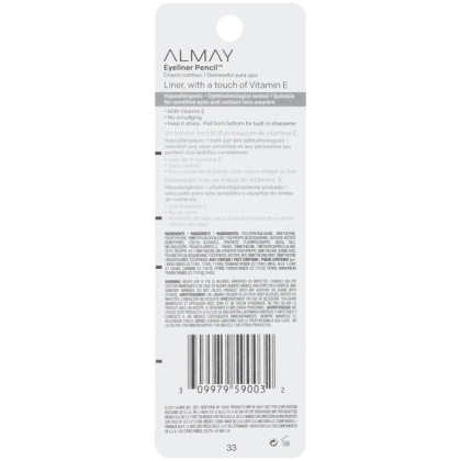 About This Item We aim to show you accurate product information. Manufacturers, suppliers and others provide what you see here, and we have not verified it. See our disclaimer Almay Eyeliner Pencil, Black Raisin brings out your eye color with rich, contrasting color! Pearlescent eyeliner defines your eyes with rich tones that make your eye color pop. Built in sharpener ensures precise application, and color resists smudging and fading throughout the day. Available in four contrasting colors for brown, blue, hazel and green eyes. Complete the look with Almay Intense i-Color look with the coordinating mascara and eyeshadow palette. Ophthalmologist tested. Suitable for sensitive eyes. Dermatologist tested. Almay - Quality ingredients. Hypoallergenic. Beautiful definition. Precisely defined eyes. Wears all day Water-resistant and smudge-proof Convenient built-in sharpener Made for sensitive eyes Hypoallergenic Opthamologist tested