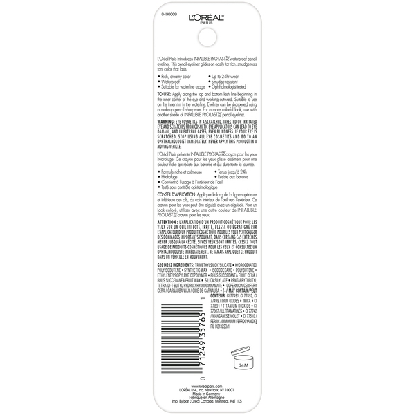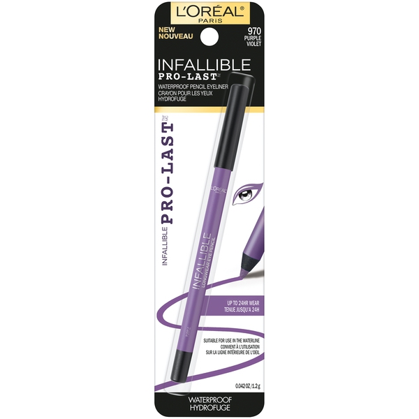 About This Item We aim to show you accurate product information. Manufacturers, suppliers and others provide what you see here, and we have not verified it. See our disclaimer L'Oreal Paris introduces Infallible Pro-Last Waterproof Pencil Eyeliner. This pencil eyeliner glides on easily for rich, smudge-resistant color that lasts. Packaging may vary. What you receive may not be what is reflected on site. Creamy, waterproof eyeliner Suitable for waterline usage Up to 24hr wear