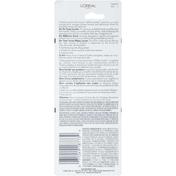 About This Item We aim to show you accurate product information. Manufacturers, suppliers and others provide what you see here, and we have not verified it. See our disclaimer L'Oreal Paris Voluminous Million Lashes Mascara L'Oreal Paris Voluminous Million Lashes Mascara creates amplified volume and definition. Our revolutionary collagen infused formula is buildable and amplifies each lash instantly. Glides on smoothly, and lasts all day, while thickening and separating every lash for a clump-free, smudge-free look. The Millionizer Brush is uniquely designed to separate lashes from corner to corner while building breathtaking volume. This defining mascara contains a built-in Clean Sweep Wiping System that wipes the brush free of clumps leaving the perfect amount of mascara for an ultra-volumized clean lash look. Packaging may vary, what you receive may not be what is reflected on site. Lash by Lash Definition Amplifying Millionizer brush Collagen infused formula Clump-free, Smudge proof mascara