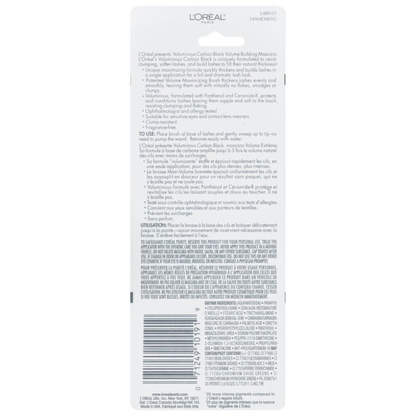 About This Item We aim to show you accurate product information. Manufacturers, suppliers and others provide what you see here, and we have not verified it. See our disclaimer "L’Oreal Paris Voluminous Original Volume Building Mascara is uniquely formulated to resist clumping, keep lashes soft, and build lashes up to 5x their natural thickness. Volume Maximizing Brush quickly thickens and builds lashes evenly for a full and bold look. Contains Panthenol and Ceramide-R and helps protect and condition lashes. Resists clumping and flaking, and leaves lashes supple and soft to the touch. Packaging may vary. What you receive may not be what is reflected on site." Bold, volume building mascara Lengthening mascara creates up to 5x fuller and thicker lashes Separates and builds every lash Clump-free and smudge-resistant mascara