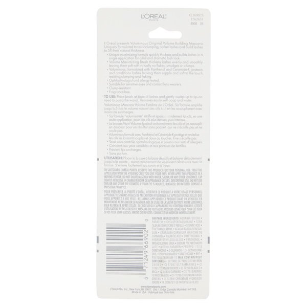 About This Item We aim to show you accurate product information. Manufacturers, suppliers and others provide what you see here, and we have not verified it. See our disclaimer "L’Oreal Paris Voluminous Original Volume Building Mascara is uniquely formulated to resist clumping, keep lashes soft, and build lashes up to 5x their natural thickness. Volume Maximizing Brush quickly thickens and builds lashes evenly for a full and bold look. Contains Panthenol and Ceramide-R and helps protect and condition lashes. Resists clumping and flaking, and leaves lashes supple and soft to the touch. Packaging may vary. What you receive may not be what is reflected on site." Bold, volume building mascara Lengthening mascara creates up to 5x fuller and thicker lashes Separates and builds every lash Clump-free and smudge-resistant mascara