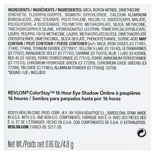 About This Item We aim to show you accurate product information. Manufacturers, suppliers and others provide what you see here, and we have not verified it. See our disclaimer Revlonî Colorstay⢠16 Hour Eye Shadow 505 Decadent. High impact, longwearing color. Velvety texture with true color payoff. Narrow tip to contour the crease and line eyes & rounded tip for all over application and blending. Revlon colorstay 16 hour eyeshadow, decadent
