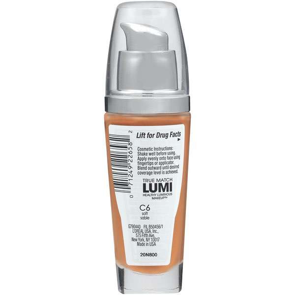 About This Item We aim to show you accurate product information. Manufacturers, suppliers and others provide what you see here, and we have not verified it. See our disclaimer L'Oréal® Paris True Match™ Lumi Healthy Luminous Makeup Finally, makeup that creates skin so healthy – it's luminous! L'Oréal Paris True Match Lumi Healthy Luminous Makeup® combines 3 powerful ingredients that work to improve your complexion the more you wear them. The liquid foundation contains 40% pure water for all-day hydration, Antioxidants, and Vitamins C and E for improved clarity and skin tone. Liquid Light technology is infused in the formula for an instant luminous glow. Skin is instantly illuminated and in 1 month, skin is clearer, healthier and more luminous. Lumi Foundation with SPF 20 protects your skin while providing medium coverage and a luminous finish. Available in 15 shades to match your skin's tone and undertone in warm, neutral and cool. Finish: Luminous Finish. SPF: 19. Coverage: Medium Coverage Foundation. Skin Type: For all skin types. Safe for sensitive skin. Available 12 true-to-skin shades in warms, neutrals, and cools. Luminous Liquid Makeup Instantly Illuminates Skin In 1 Month, Skin's Clearer, More Even Anti-oxidants Vitamin C plus E