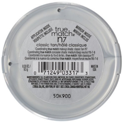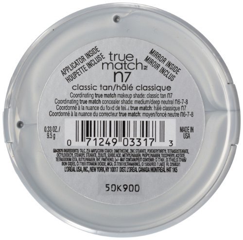 About This Item We aim to show you accurate product information. Manufacturers, suppliers and others provide what you see here, and we have not verified it. See our disclaimer True Match Powder precisely matches your skin's texture and tone and coordinates perfectly with True Match Makeup, Blush, and Concealer.Micro-fine powder provides versatile coverage : blot shine, blend all over for a natural finish or build for more coverage. Wear over True Match Makeup or alone for a flawless look .Exclusive triple-refined formula makes it possible to match your skin's texture. Never looks chalky or cakey. - Oil-free - Non-comedogenic Inside includes: - Applicator - Mirror Made in USAIngredients: Talc, Zea Mays (Corn) (Corn Starch), Dimethicone, Zinc Stearate, Pentaerythrityl Tetraisostearate, Octyldodecyl Stearoyl Stearate, Zeolite, Sorbic Acid (A Preservative), Methylparaben, Propylparaben, Tocopheryl Acetate (Vitamin E), Tetrasodium EDTA, Butylparaben, BHT, Panthenol, May Contain (+/-): Iron Oxides (CI 77491, CI 77492, CI 77499), Titanium Dioxide (CI 77891), Mica, Ultramarines (CI 77007), Red 7 Lake (CI 15850).Directions: Using a light touch, and the provided applicator, sweep all over the face to create a natural finish -- and to set makeup and/or concealer. L'Oreal True Match Powder, Classic Tan [N7], 0.33 oz L'Oreal True Match Powder, Classic Tan [N7], 0.33 oz