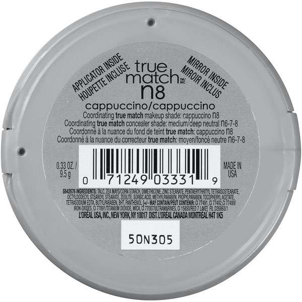 About This Item We aim to show you accurate product information. Manufacturers, suppliers and others provide what you see here, and we have not verified it. See our disclaimer True Match Powder precisely matches your skin's tone and texture and coordinates perfectly with True Match Makeup, Blush, and Concealer. Micro-fine powder provides versatile coverage: you can blot shine, blend for a natural finish, or build for more coverage. True Match Powder's formula contains a hint of pearl pigments that enhance your skin's tone. Wear True Match Powder over True Match Makeup or alone for a flawless look. L'Oreal Paris True Match&trade Super-Blendable Powder: Precisely matches your skin tone and texture Never looks chalky or cakey Natural Finish L'Oreal Paris True Match Pressed Powder:Exclusive triple-refined formula Never looks chalky or cakeyOil-free and non-comedogenic Contains skin tone enhancing pearl pigments Buildable, versatile coverage