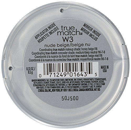 About This Item We aim to show you accurate product information. Manufacturers, suppliers and others provide what you see here, and we have not verified it. See our disclaimer L'Oreal Paris True Match Super-Blendable Powder, Nude Beige, 0.33 oz. Color:Nude Beige True Match Powder precisely matches your skin's tone and texture and coordinates perfectly with True Match Makeup, Blush, and Concealer. Micro-fine powder provides versatile coverage: you can blot shine, blend for a natural finish, or build for more coverage. True Match Powder's formula contains a hint of pearl pigments that enhance your skin's tone. Wear True Match Powder over True Match Makeup or alone for a flawless look. Precisely matches your skin tone and texture,Never looks chalky or cakey,Natural Finish,Mirror inside,Applicator Inside In true to you shades, Find Your Match Mattify Skin - not chalky or cakey Natural finish - undetectable coverage Blot oil and control shine