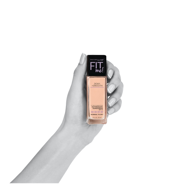 About This Item We aim to show you accurate product information. Manufacturers, suppliers and others provide what you see here, and we have not verified it. See our disclaimer Maybelline Fit Me Dewy + Smooth Foundation Get smooth, hydrated, and even skin tone with Fit Me Dewy + Smooth foundation. Formulated to deliver hydrated and smooth skin with a natural luminous finish. Also, this foundation makeup has the added benefit of sun protection SPF 18. The end result is beautifully dewy and smooth skin with a shade that fits you. Dermatologist tested. Allergy tested. Non-comedogenic. Fragrance-free. Packaging may vary, what you receive may not be what is reflected on site. Dewy and smooth foundation makeup with SPF 18 Hydrating foundation smoothes skin's texture Leaves a naturally luminous finish Moisturizing foundation ideal for normal to dry skin