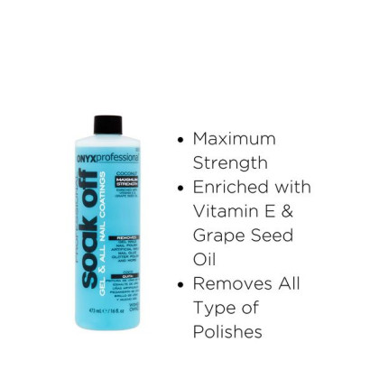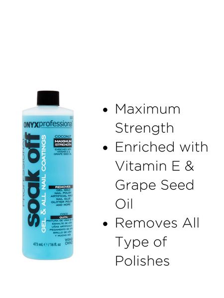 About This Item We aim to show you accurate product information. Manufacturers, suppliers and others provide what you see here, and we have not verified it. See our disclaimer Keep your nails clean between manicures with this ONYX Professional Gel and All Nail Coatings Soak-Off Nail Polish Remover (Coconut). It is formulated to remove a variety of finishes. Made with a maximum-strength formula, this ONYX nail polish remover is available in a 16 fl oz size, providing you with plenty to use. ONYX Professional Gel And All Nail Coatings Soak Off Nail Polish Remover Coconut: Nail polish and remover drying product Gel nail polish remover will effectively remove gel nails, nail polish, artificial nails, nail glue, glitter polish and more Maximum-strength formula Enriched with vitamin E and grape seed oil Size: 16 fl oz