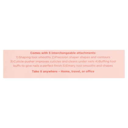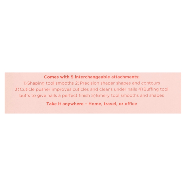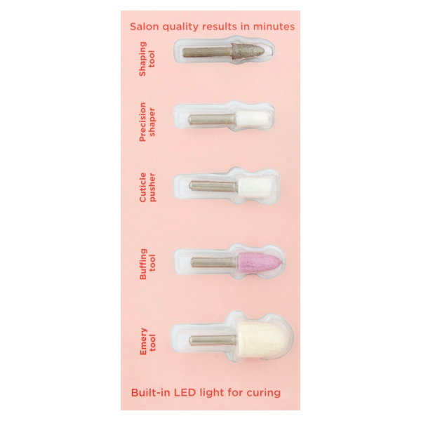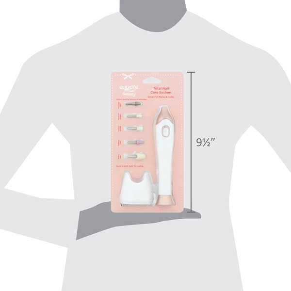 About This Item We aim to show you accurate product information. Manufacturers, suppliers and others provide what you see here, and we have not verified it. See our disclaimer Skip the salon and achieve professional-looking results in minutes with the Equate Beauty Equate Total Nail Care System. It comes with the main tool and five interchangeable attachment heads, including a shaping tool, a precision shaper, a cuticle pusher, a buffing tool and an emery tool. It also includes a built-in LED light for curing gel nails and a base for convenient upright storing. The Equate Beauty Equate Total Nail Care System is suitable for pedicures and manicures. The portable design makes it handy for use at home or on the go. Equate Beauty understands that beauty isn't just skin deep. With a large selection of the latest beauty products, Equate Beauty helps you be your best you. Equate Beauty Equate Total Nail Care System: Ideal for manicures and pedicures Effective and easy to use Salon quality results in minutes Multifunctional stand for curing gel nails (with built-in LED light) and for storage of all heads Comes with 5 interchangeable attachments: Shaping tool to smooth and shape nails Precision shaper to shape and contour Cuticle pusher to improve cuticles and clean under nails Buffing tool to buff nails to a high-gloss shine Emery tool to smooth and shape nails Ideal for use at home or on the go Nail care tools come with a base for upright storing