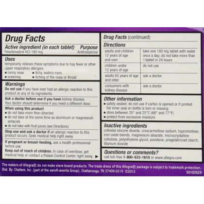 About This Item We aim to show you accurate product information. Manufacturers, suppliers and others provide what you see here, and we have not verified it. See our disclaimer ALLEGRA 30 COUNT TABLETS FACTORY NEW AND SEALED BOX. EXP 09/2014 OR LONGER!! Allegra 24 Hour Allergy Relief Antihistamine Tablets, 30ct Original Prescription Strength Fexofenadine hydrochloride 24hr relief from Indoor and Outdoor allergies Non-drowsy Relieves runny nose, sneezing, itchy watery eyes, and itching of the nose or throat Starts working in one hour Can be used every day