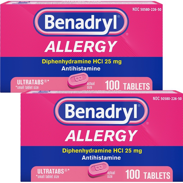 About This Item We aim to show you accurate product information. Manufacturers, suppliers and others provide what you see here, and we have not verified it. See our disclaimer Benadryl Allergy UltraTabs in 100 offer effective allergy relief from upper respiratory allergy and common cold symptoms in a small tablet size. The antihistamine tablets each contains 25 milligrams of the antihistamine diphenhydramine HCl to temporarily relieve allergy symptoms like sneezing; runny nose; itchy throat and nose; and itchy, watery eyes and the common cold symptoms of runny nose and sneezing. Benadryl UltraTabs with diphenhydramine HCl 25 mg are intended for adults and children ages six and up. The allergy tablets work when you need it most and provide multi-symptom allergy relief. 100-count packs of Benadryl UltraTabs each with 25 mg of the antihistamine diphenhydramine HCl Provides temporary allergy symptom relief for sneezing; runny nose; itchy nose or throat; and itchy, watery eyes Provides temporary relief of cold symptoms like sneezing and runny nose to offer more than just allergy relief 100 of allergy tablets for ages 6 and up for multi-symptom allergy relief Active ingredient, diphenhydramine HCl, provides relief for allergy symptoms and cold symptoms Offers allergy symptom and cold symptom relief with the help of an antihistamine Convenient, small antihistamine tablets offer powerful relief to put your allergies to rest