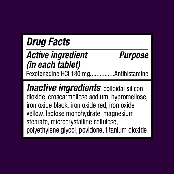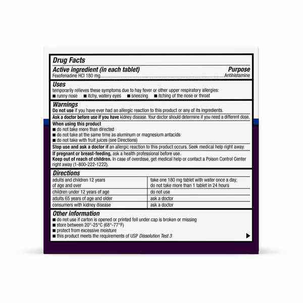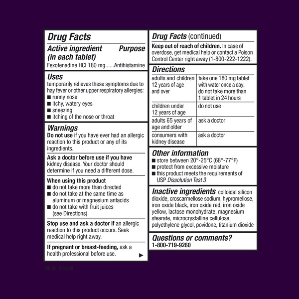 About This Item We aim to show you accurate product information. Manufacturers, suppliers and others provide what you see here, and we have not verified it. See our disclaimer The active ingredient in this product is Fexofenadine Hydrochloride 180 mg, an antihistamine approved for the treatment of both indoor and outdoor allergy symptoms. One dose of Fexofenadine Hydrochloride Tablets, 180 mg works for a full 24 hours. Fexofenadine Hydrochloride Tablets, 180 mg is approved to temporarily relieve indoor and outdoor allergy symptoms in adults and children 12 years of age and older. Made in Israel Compare to Allegra® Allergy active ingredient Relief of: Sneezing; Runny Nose; Itchy, Watery Eyes; Itchy Nose or Throat Indoor & Outdoor Allergies Non-Drowsy
