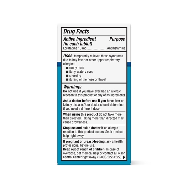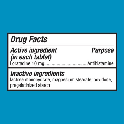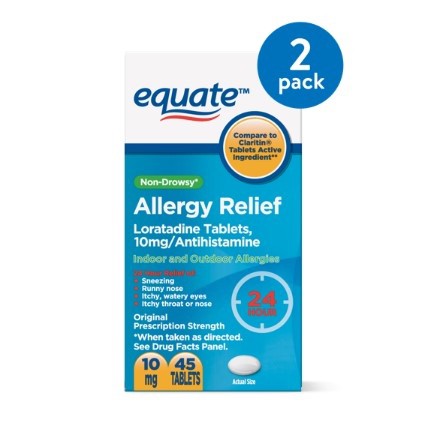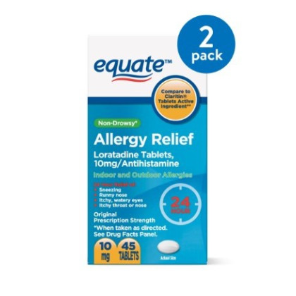 About This Item We aim to show you accurate product information. Manufacturers, suppliers and others provide what you see here, and we have not verified it. See our disclaimer With allergy relief from Loratadine Tablets 10 mg, you will once again be the boss of spring – and any other time when you suffer allergy symptoms, outdoor or indoor. One dose of Loratadine Tablets 10 mg provides all day, 24 hour relief of sneezing; runny nose; itchy, watery eyes; itchy throat or nose. The active ingredient is loratadine 10 mg, an antihistamine in original prescription strength that won’t make you drowsy when taken as directed. Compare to Claritin® Tablets active ingredient. Equate Non-Drowsy Allergy Relief Loratadine Tablets, 10 mg, 45 Ct: ALLERGY MEDICINE: Loratadine Tablets 10 mg temporarily relieves symptoms due to hay fever or other upper respiratory allergies: runny nose; itchy, watery eyes; sneezing; itching of the nose or throat. 24 HOUR SYMPTOM RELIEF: One dose of Loratadine Tablets 10 mg works for a full 24 hours to relieve allergy symptoms. ORIGINAL PRESCRIPTION STRENGTH: Loratadine Tablets 10 mg is approved to temporarily relieve indoor and outdoor allergy symptoms in adults and children 6 years and over. ACTIVE INGREDIENT: Compare to Claritin® Tablets Active Ingredient. The active ingredient in Loratadine Tablets 10 mg is loratadine 10 mg, an antihistamine approved for the treatment of both indoor and outdoor allergy symptoms. ADULTS & CHILDREN 6 YEARS AND OVER: Take one Loratadine 10 mg tablet daily; not more than 1 tablet in 24 hours. Children under 6 years of age: ask a doctor. Consumers with liver or kidney disease: ask a doctor.