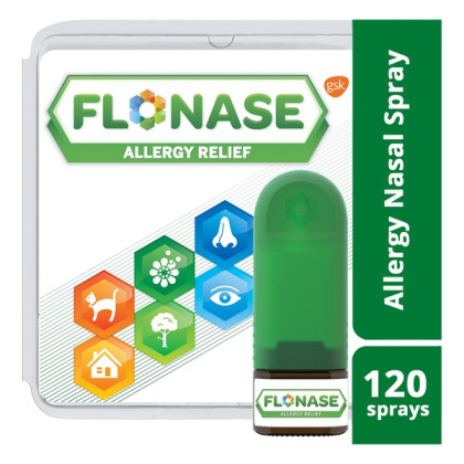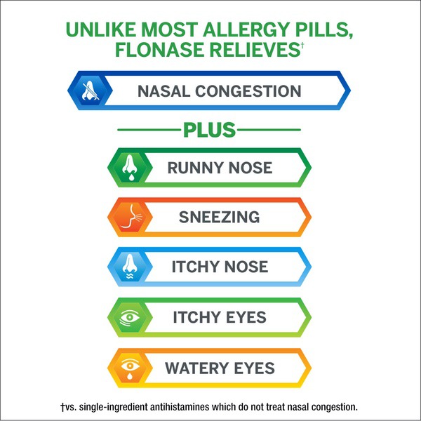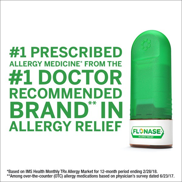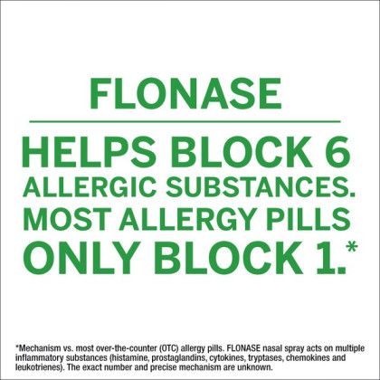About This Item We aim to show you accurate product information. Manufacturers, suppliers and others provide what you see here, and we have not verified it. See our disclaimer FLONASE Allergy Relief nasal spray gives you more complete allergy relief than most over-the-counter allergy pills and tablets.* FLONASE helps block 6 key allergic substances. Most allergy pills only block histamine.** Full prescription strength FLONASE provides 24-hour relief from nasal congestion, runny nose, sneezing, itchy nose, and itchy, watery eyes all allergy season long. Plus, when used once daily, it outperforms the number 1 non-drowsy allergy pill!† It's no wonder why FLONASE Allergy Relief is the number 1 doctor recommended allergy brand.†† *vs. single-ingredient antihistamines which do not treat nasal congestion. **Mechanism vs. most over-the-counter (OTC) allergy pills. FLONASE nasal spray acts on multiple inflammatory substances (histamine, prostaglandins, cytokines, tryptases, chemokines and leukotrienes). The exact number and precise mechanism are unknown. †Total nasal symptom relief vs. 10 mg single-ingredient loratadine. ††Among over-the-counter (OTC) allergy medications based on physician's survey dated 6/23/17. FLONASE relieves nasal congestion, runny nose, sneezing, itchy nose, and itchy, watery eyes FLONASE Allergy Relief is the number 1 doctor recommended allergy brand (Among over the counter (OTC) allergy medications based on physician's survey dated 6/23/17) Full prescription strength FLONASE provides non drowsy, 24 hour relief Use once daily throughout allergy season for continuous relief Contains the active ingredient fluticasone propionate