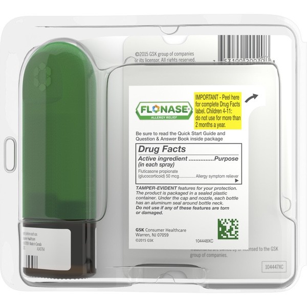 About This Item We aim to show you accurate product information. Manufacturers, suppliers and others provide what you see here, and we have not verified it. See our disclaimer FLONASE Allergy Relief nasal spray gives you more complete allergy relief than most over-the-counter allergy pills and tablets.* FLONASE helps block 6 key allergic substances. Most allergy pills only block histamine.** Full prescription strength FLONASE provides 24-hour relief from nasal congestion, runny nose, sneezing, itchy nose, and itchy, watery eyes all allergy season long. Plus, when used once daily, it outperforms the number 1 non-drowsy allergy pill!† It's no wonder why FLONASE Allergy Relief is the number 1 doctor recommended allergy brand.†† *vs. single-ingredient antihistamines which do not treat nasal congestion. **Mechanism vs. most over-the-counter (OTC) allergy pills. FLONASE nasal spray acts on multiple inflammatory substances (histamine, prostaglandins, cytokines, tryptases, chemokines and leukotrienes). The exact number and precise mechanism are unknown. †Total nasal symptom relief vs. 10 mg single-ingredient loratadine. ††Among over-the-counter (OTC) allergy medications based on physician's survey dated 6/23/17. FLONASE relieves nasal congestion, runny nose, sneezing, itchy nose, and itchy, watery eyes FLONASE Allergy Relief is the number 1 doctor recommended allergy brand (Among over the counter (OTC) allergy medications based on physician's survey dated 6/23/17) Full prescription strength FLONASE provides non drowsy, 24 hour relief Use once daily throughout allergy season for continuous relief Contains the active ingredient fluticasone propionate