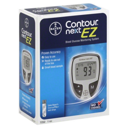 About This Item We aim to show you accurate product information. Manufacturers, suppliers and others provide what you see here, and we have not verified it. See our disclaimer Keep an eye on your levels using the Bayer Contour Next EZ 7252 Blood Glucose Monitoring System. It is ready to use right out of the box and also comes with a carrying case. Designed for self-testing and monitoring, it gives accurate readings using the included lancing device and microlet colored lancets. Keep track of your levels in the logbook. The Bayer blood glucose monitor only takes a small sample and has settings you can personalize to fit your preferences. Blood Glucose Monitoring System 7252. Proven accuracy. Easy to use. Ready to use out of the box. Small blood sample. Uses Bayer's Contour Next test strips. No coding. Simple to use: No Coding technology. Small blood sample - 0.6 ml. Fast 5-second countdown. Personalized settings: optional advanced features. Pre - and post-meal markers with adjustable testing alarms. Can be used with Bayer's diabetes management software. For self-testing, monitoring and management of blood glucose. In this kit you will find: Contour Next EZ Blood Glucose Meter; User guide and quick reference guide; Bayer's Microlet 2 lancing device; 10 Microlet colored lancets; Log book and carrying case. Contour Next control solutions (required to run a quality control check) are sold separately. Contour Next test strips (required to run a blood glucose test) are sold separately. Visit ContourChoice.com for savings, support, special offers, and more. 5 year limited warranty. Bayer HealthCare LLC is dedicated to providing the highest quality products and services to our customers. www.bayercontour.com. For sale in United States only. Meter made in Japan.