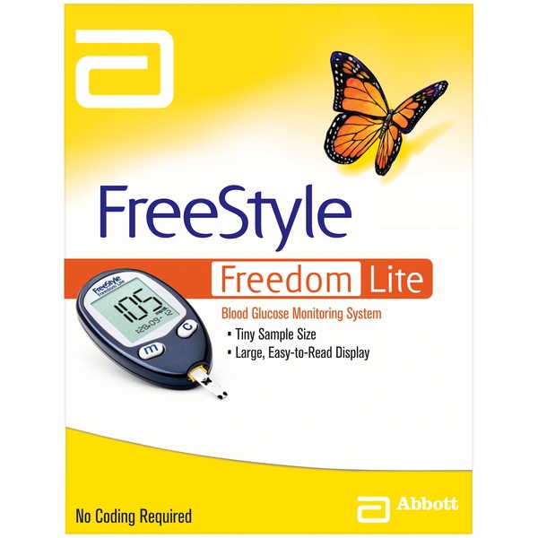 About This Item We aim to show you accurate product information. Manufacturers, suppliers and others provide what you see here, and we have not verified it. See our disclaimer The FreeStyle Freedom Lite blood glucose monitoring system features a large numeric display, so it is easy to read your test results. Additionally, the FreeStyle Freedom Lite meter is ergonomically designed to feel comfortable in your hand. There is no coding needed and this meter requires a small blood sample size. Easy to read, large numeric display Easy to hold, large comfortable design No coding, means one less step Small sample size, only 0.3 microliter Fast, 5-second average test time Contents include: FreeStyle Freedom Lite Blood Glucose Meter, 1 Lancing Device, 10 Lancets, Carrying Case, English/Spanish Owner's Booklet For use with FreeStyle Lite test strips only, sold separately