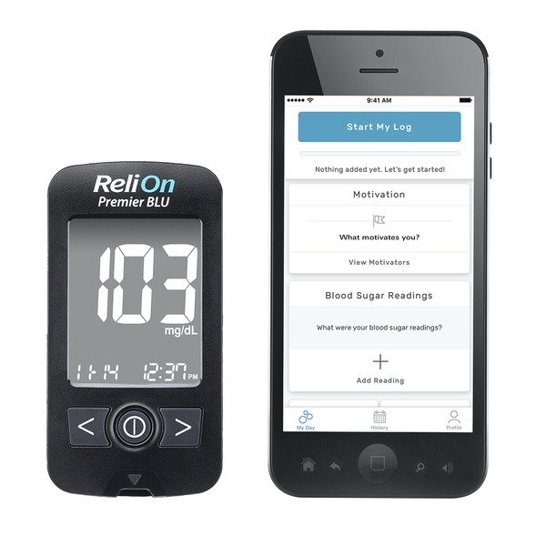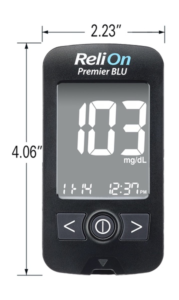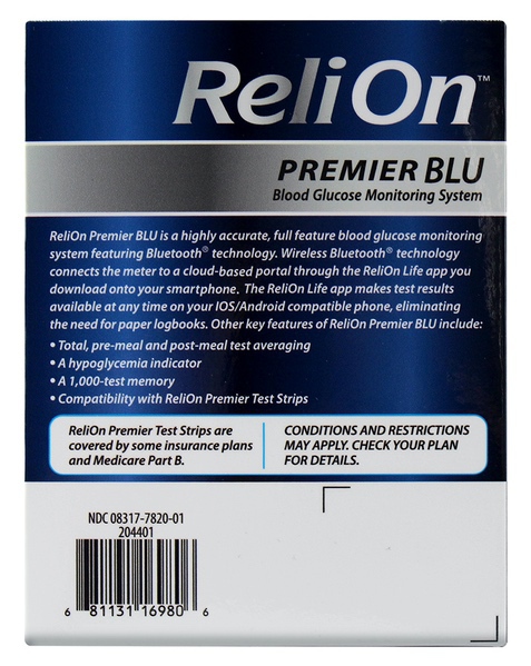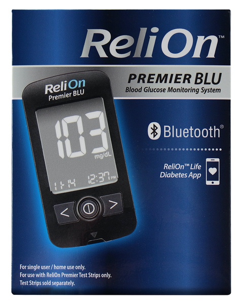 About This Item We aim to show you accurate product information. Manufacturers, suppliers and others provide what you see here, and we have not verified it. See our disclaimer ReliOn Premier BLU is a highly accurate, full-featured blood-glucose monitoring system featuring Bluetooth technology. Wireless Bluetooth technology connects the meter to a cloud-based portal through the ReliOn Life app you download onto your smartphone. The ReliOn Life app makes test results available at any time on your iOS/Android compatible phone, eliminating the need for paper logbooks. In addition, the portable form factor of the BLU makes it easy to store or to take on the go so you can always get an accurate glucose reading anywhere. The ReliOn Premier BLU is for use with ReliOn Premier family of blood glucose test strips only. ReliOn understands all the ways diabetes touches your life. With affordable, reliable products and total lifestyle support, ReliOn helps you be your best you. ReliOn Premier BLU Blood Glucose Monitoring System: For use with ReliOn Premier family of blood glucose test strips only Total, pre-meal and post-meal test averaging A hypoglycemia indicator A 1,000-test memory