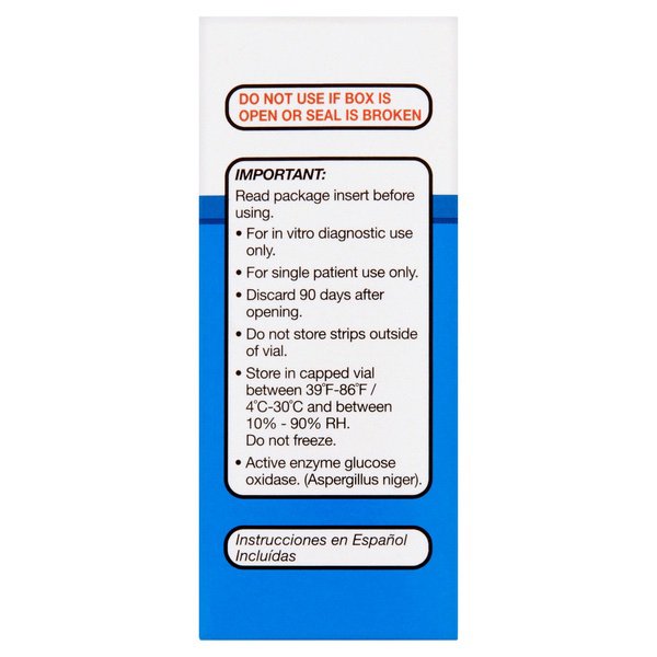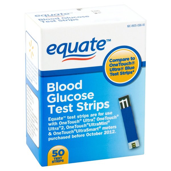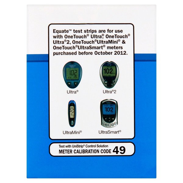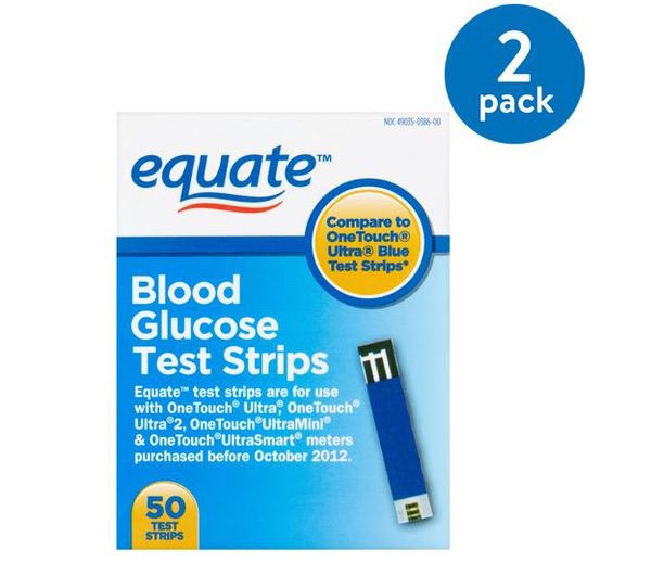 About This Item We aim to show you accurate product information. Manufacturers, suppliers and others provide what you see here, and we have not verified it. See our disclaimer Keep your sugar levels in check with Equate Blood Glucose Test Strips. A mainstay of blood glucose testing, they aid patients in monitoring and controlling diabetes. A tiny speck of blood from the fingertip or palm is placed on the strip, and the meter provides a reading. Our test strips are for use with OneTouch Ultra®, One Touch Ultra 2®, Ultra Mini®, and One Touch Ultra Smart® meters purchased before October 2012 (each sold separately). Our 50-count pack is a cost-effective alternative to more expensive brands and is available without a prescription. A great value at a great price, you can afford to test more frequently and successfully with the help of Equate Blood Glucose Test Strips. Use with hand held blood glucose meter Compatible with OneTouch Ultra®, One Touch Ultra 2®, Ultra Mini®, and One Touch Ultra Smart® glucose meters purchased before October 2012 Blood sugar test strips come in a 50ct box Single patient use Requires only a speck of blood