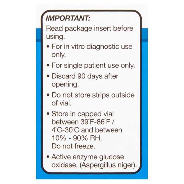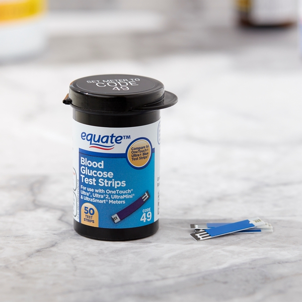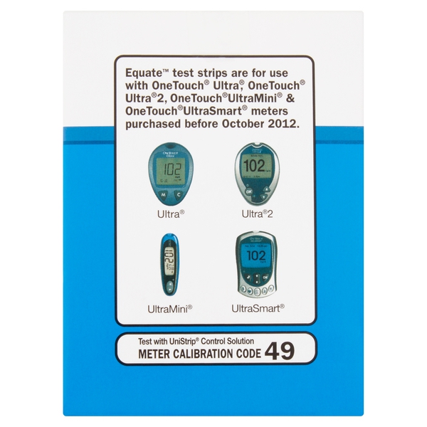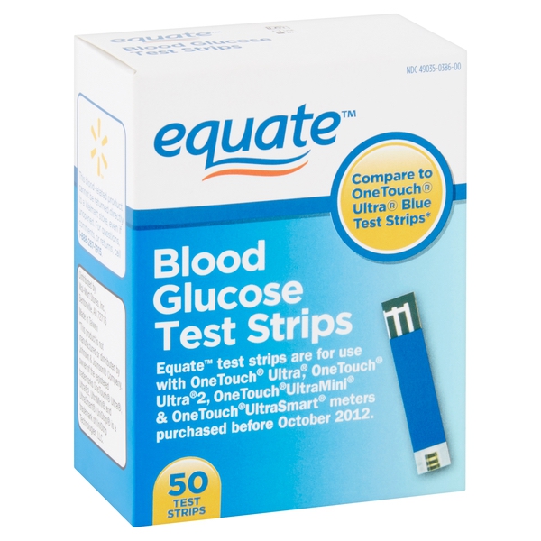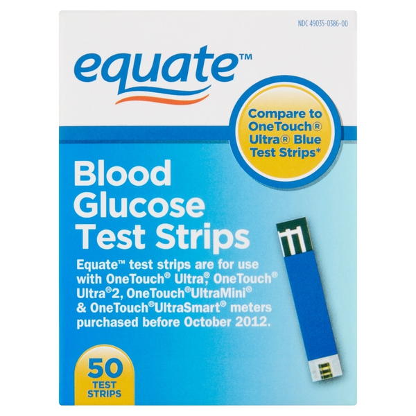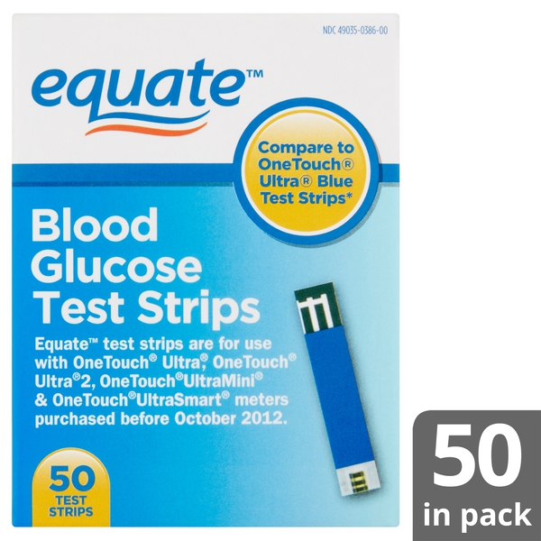 About This Item We aim to show you accurate product information. Manufacturers, suppliers and others provide what you see here, and we have not verified it. See our disclaimer Keep your sugar levels in check with Equate Blood Glucose Test Strips. A mainstay of blood glucose testing, they aid patients in monitoring and controlling diabetes. A tiny speck of blood from the fingertip or palm is placed on the strip, and the meter provides a reading. Our test strips are for use with OneTouch Ultra®, One Touch Ultra 2®, Ultra Mini®, and One Touch Ultra Smart® meters purchased before October 2012 (each sold separately). Our 50-count pack is a cost-effective alternative to more expensive brands and is available without a prescription. A great value at a great price, you can afford to test more frequently and successfully with the help of Equate Blood Glucose Test Strips. Use with hand held blood glucose meter Compatible with OneTouch Ultra®, One Touch Ultra 2®, Ultra Mini®, and One Touch Ultra Smart® glucose meters purchased before October 2012 Blood sugar test strips come in a 50ct box Single patient use Requires only a speck of blood