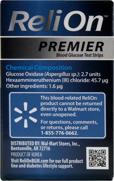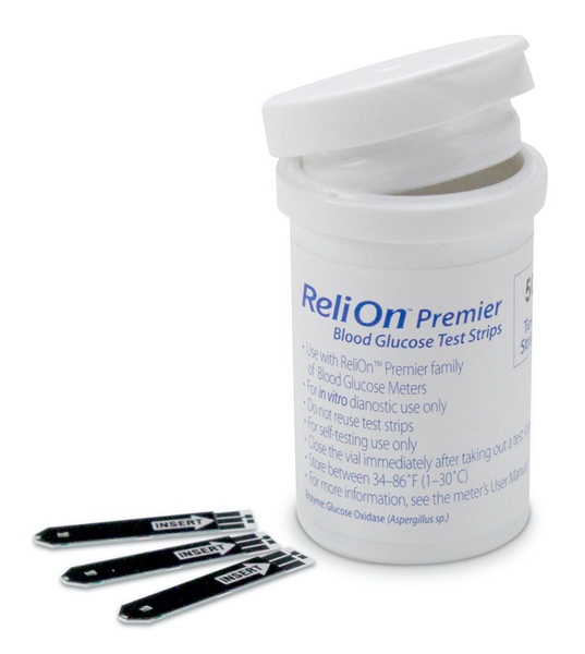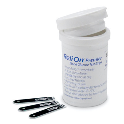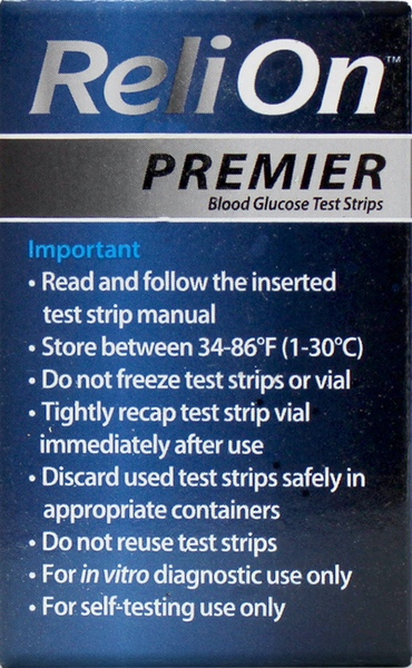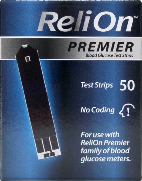 About This Item We aim to show you accurate product information. Manufacturers, suppliers and others provide what you see here, and we have not verified it. See our disclaimer Monitor and manage your diabetes with these ReliOn Premier Blood Glucose Test Strips. They are easy to use and provide fast, accurate readings you can count on. These ReliOn test strips require no coding, eliminating steps and doing away with the possibility of a false result. They are small, requiring just a 0.5 microliter blood sample making the process more pleasant. These ReliOn Premier Blood Glucose Test Strips are easy to use and disposable. They are suitable for the ReliOn Premier family of blood glucose meters including ReliOn Premier Voice and ReliOn Premier BLU. They are available in a convenient 50-count box. ReliOn understands all the ways diabetes touches your life. With affordable, reliable products and total lifestyle support, ReliOn helps you be your best you. ReliOn Premier Blood Glucose Test Strips, 50-Count: No coding required 0.5 microliter blood sample size 5-second test time Highly accurate Economical For use with ReliOn Premier family of blood glucose meters only (ReliOn Premier Voice, ReliOn Premier BLU) Easy to use Small size Store between 34-86-degrees F (1-30-degrees C) Tightly recap test strip vial immediately after use Do not reuse test strips For in vitro diagnostic use only For self-testing use only FDA cleared; proven clinical accuracy Blood glucose meter strips, 50-count box