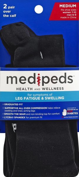 About This Item We aim to show you accurate product information. Manufacturers, suppliers and others provide what you see here, and we have not verified it. See our disclaimer MediPeds Nylon Over the Calf Crew Socks provide the support you need for all-day comfort. Specially designed for those with circulatory issues or swelling and fatigue in the ankle or calf, they're made of soft and stretchy nylon. Their graduated sizing fits snugly in the right places with moderate compression, improving blood flow and circulation through the legs and the feet. This provides comfortable support during normal activities or when sitting or standing for extended periods. An extra-wide top makes them easier to put on and to take off. This package contains 2 pairs of circulatory socks that fit both men's and women's shoe sizes. MediPeds Circulatory Sock, 2 Pairs: Designed for relief of leg fatigue and swelling Graduated fit All-day support Nylon over the calf Extra-wide top Medium size Fits women's shoe sizes 7 to 10 and men's shoe sizes 6 to 9 Mild compression MediPeds crew socks help to improve circulation Country of Origin: United States