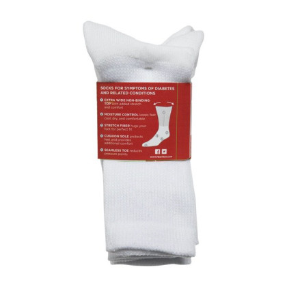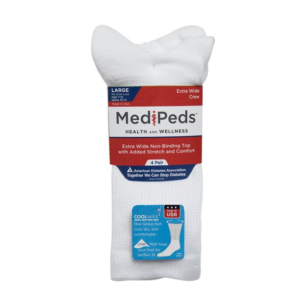 About This Item We aim to show you accurate product information. Manufacturers, suppliers and others provide what you see here, and we have not verified it. See our disclaimer Get the comfort of cushioned sole socks with the MediPeds Mens COOLMAX Extra Wide Crew, 4-Pack. They have moisture wicking to help keep feet cool, dry, and comfortable. These MediPeds socks have a non-binding top with extra stretch and comfort as well as have a smooth toe seam that reduces pressure points. The men's cushion socks has stretch fiber that hugs your foot for better fit and comes in a convenient pack of four. COOLMAX fiber keeps feet cool, dry, and comfortable Stretch fiber hugs your foot for perfect fit Extra wide non-binding top with added stretch and comfort Cushion sole protects feet and provides additional comfort Smooth toe seam reduces pressure points 59% Polyester, 36% COOLMAX Polyester, 3% LYCRA Fiber, 2% Nylon Country of Origin: Imported