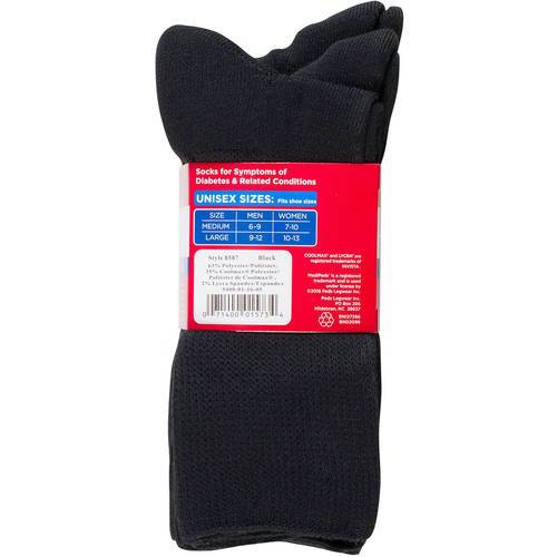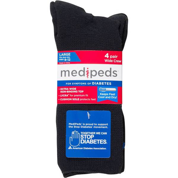 About This Item We aim to show you accurate product information. Manufacturers, suppliers and others provide what you see here, and we have not verified it. See our disclaimer Get the comfort of cushioned sole socks with the MediPeds Mens COOLMAX Extra Wide Crew, 4-Pack. They have moisture wicking to help keep feet cool, dry, and comfortable. These MediPeds socks have a non-binding top with extra stretch and comfort as well as have a smooth toe seam that reduces pressure points. The men's cushion socks has stretch fiber that hugs your foot for better fit and comes in a convenient pack of four. COOLMAX fiber keeps feet cool, dry, and comfortable Stretch fiber hugs your foot for perfect fit Extra wide non-binding top with added stretch and comfort Cushion sole protects feet and provides additional comfort Smooth toe seam reduces pressure points 59% Polyester, 36% COOLMAX Polyester, 3% LYCRA Fiber, 2% Nylon Country of Origin: Imported