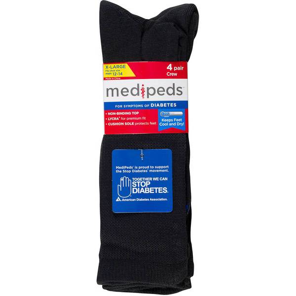 About This Item We aim to show you accurate product information. Manufacturers, suppliers and others provide what you see here, and we have not verified it. See our disclaimer Get the comfort of cushioned sole socks with the MediPeds Mens COOLMAX Crew, 4-Pack. They have moisture wicking to help keep feet cool, dry, and comfortable. These MediPeds socks have a non-binding top with extra stretch and comfort as well as have a smooth toe seam that reduces pressure points. The men's cushion socks has stretch fiber that hugs your foot for better fit and comes in a convenient pack of four. COOLMAX fiber keeps feet cool, dry, and comfortable Stretch fiber hugs your foot for perfect fit Non-binding top with extra stretch and comfort Cushion sole protects feet and provides additional comfort Smooth toe seam reduces pressure points 66% Polyester, 30% COOLMAX Polyester, 2% LYCRA Fiber, 2% Nylon Country of Origin: United States