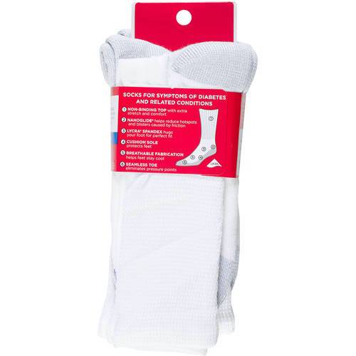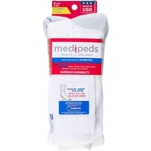 About This Item We aim to show you accurate product information. Manufacturers, suppliers and others provide what you see here, and we have not verified it. See our disclaimer Get the comfort of cushioned sole socks with the MediPeds Mens NanoGLIDE Crew, 4-Pack. They have NanoGLIDE technology that helps reduce hot spots and blisters caused by friction. These MediPeds socks have a reinforced heel and toe for superior durability, a non-binding top with extra stretch and comfort, and a seamless toe that reduces pressure points. The men's cushion socks has stretch fiber that hugs your foot for better fit and comes in a convenient pack of four. NanoGLIDE helps reduce hot spots and blisters caused by friction Reinforced heel and toe for superior durability Non-binding top with extra stretch and comfort Stretch fiber hugs your foot for perfect fit Cushion sole protects feet and provides additional comfort Seamless toe reduces pressure points 58% Polyester, 37% Acrylic, 3% Nylon, 2% LYCRA Fiber Country of Origin: United States