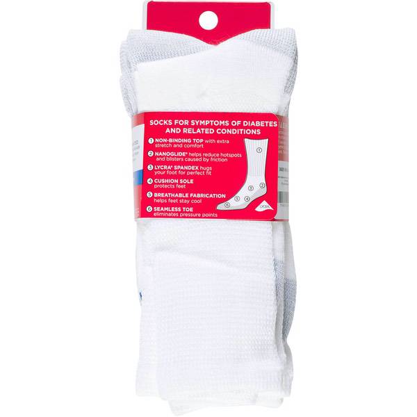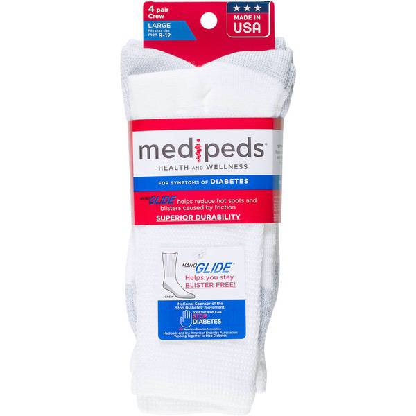 About This Item We aim to show you accurate product information. Manufacturers, suppliers and others provide what you see here, and we have not verified it. See our disclaimer Get the comfort of cushioned sole socks with the MediPeds Mens NanoGLIDE Crew, 4-Pack. They have NanoGLIDE technology that helps reduce hot spots and blisters caused by friction. These MediPeds socks have a reinforced heel and toe for superior durability, a non-binding top with extra stretch and comfort, and a seamless toe that reduces pressure points. The men's cushion socks has stretch fiber that hugs your foot for better fit and comes in a convenient pack of four. NanoGLIDE helps reduce hot spots and blisters caused by friction Reinforced heel and toe for superior durability Non-binding top with extra stretch and comfort Stretch fiber hugs your foot for perfect fit Cushion sole protects feet and provides additional comfort Seamless toe reduces pressure points 57% Polyester, 36% Acrylic, 5% Nylon, 2% LYCRA Fiber