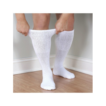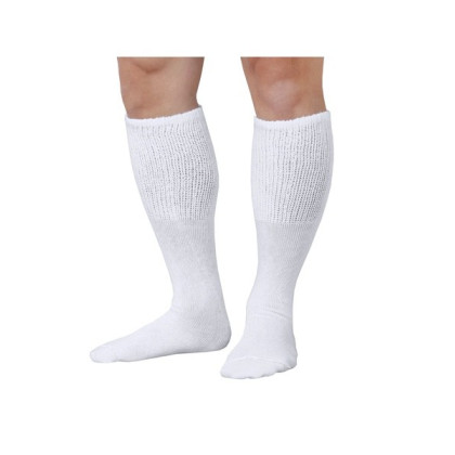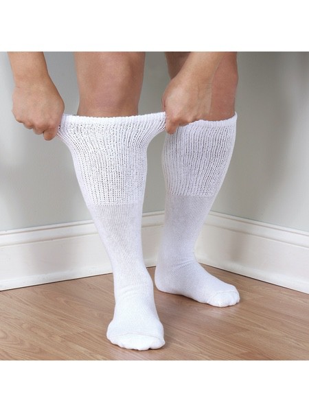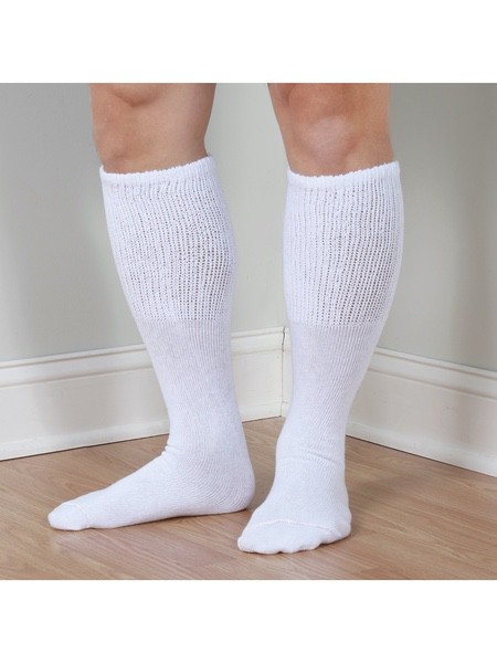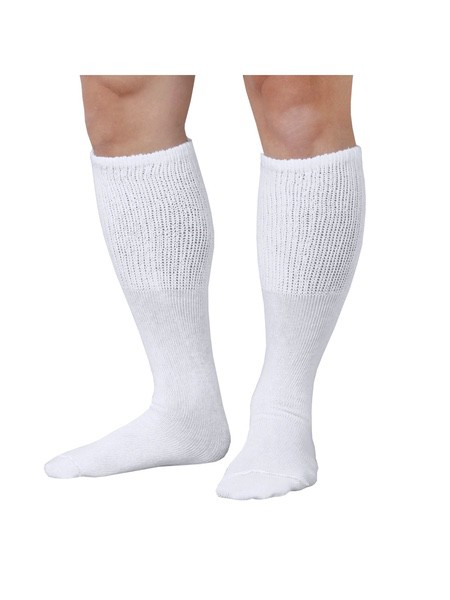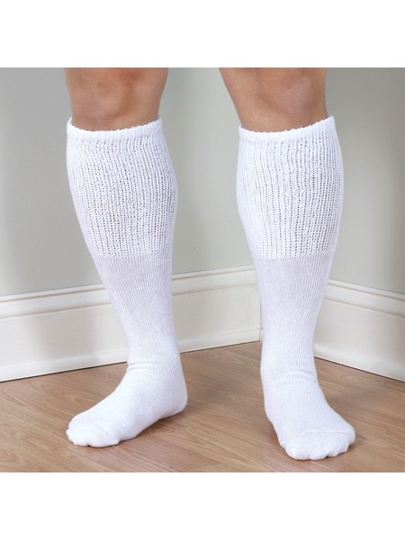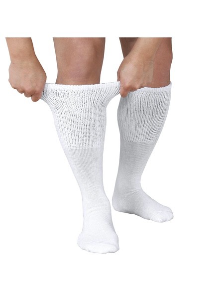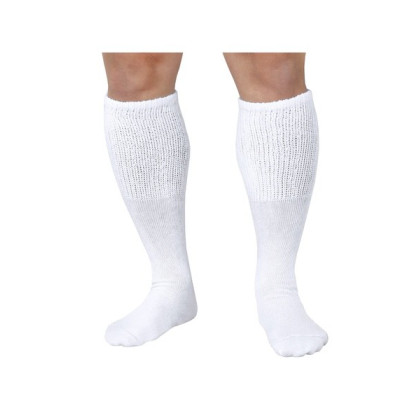 About This Item We aim to show you accurate product information. Manufacturers, suppliers and others provide what you see here, and we have not verified it. See our disclaimer Diabetic Friendly Tube Socks for Wide Feet Tube socks are a great staple - one size fits most and stretches to fit most heights. These tube socks have a seam-free toe for sensitive feet and a stretch foot that fits up to 4E/6E wide foot. Stretch calf is non-binding and fits up to 22" wide calf. Foot size fits sizes 9-15, and will fit over walking casts and Unna boots. Cotton/Nylon/ Spandex. USA. 3 pairs. Black or White. * Stretches to fit most heights and widths * Seam-free toe * Non-binding top fits up to 22" wide calf EXTRA WIDE SOCKS - Three pairs of comfortable, wide-fitting tube socks designed to fit those with edema and diabetic foot swelling. INCREDIBLY COMFORTABLE - These tube socks have a seam-free toe for sensitive feet SUPER STRETCHY - Socks feature a stretch foot that fits up to 4E/6E wide foot. The non-binding stretch calf fits up to 22" wide calf and will fit over walking casts and Unna boots. MADE IN THE USA - Quality cotton/nylon/spandex blend socks are made in America. Country of Origin: China