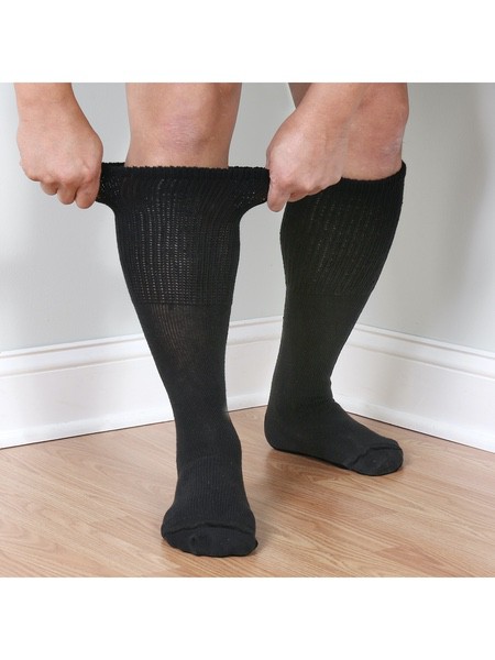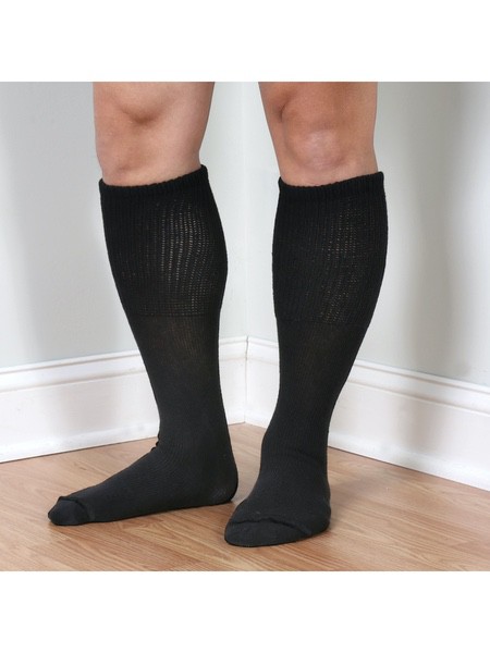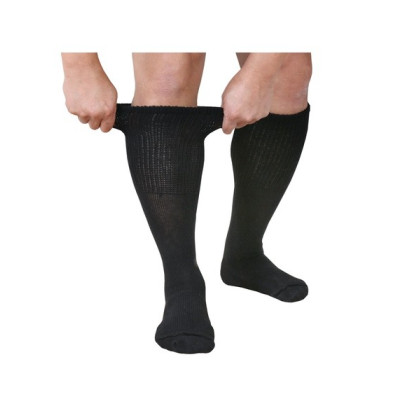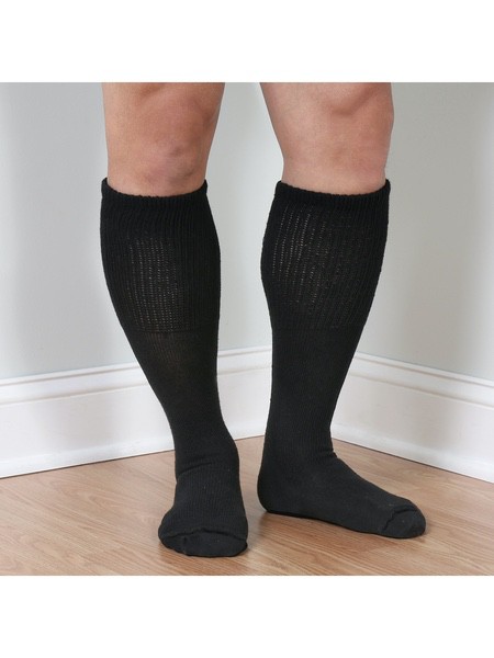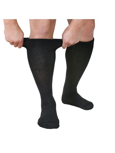 About This Item We aim to show you accurate product information. Manufacturers, suppliers and others provide what you see here, and we have not verified it. See our disclaimer Diabetic Friendly Tube Socks for Wide Feet Tube socks are a great staple - one size fits most and stretches to fit most heights. These tube socks have a seam-free toe for sensitive feet and a stretch foot that fits up to 4E/6E wide foot. Stretch calf is non-binding and fits up to 22" wide calf. Foot size fits sizes 9-15, and will fit over walking casts and Unna boots. Cotton/Nylon/ Spandex. USA. 3 pairs. Black or White. * Stretches to fit most heights and widths * Seam-free toe * Non-binding top fits up to 22" wide calf EXTRA WIDE SOCKS - Three pairs of comfortable, wide-fitting tube socks designed to fit those with edema and diabetic foot swelling. INCREDIBLY COMFORTABLE - These tube socks have a seam-free toe for sensitive feet SUPER STRETCHY - Socks feature a stretch foot that fits up to 4E/6E wide foot. The non-binding stretch calf fits up to 22" wide calf and will fit over walking casts and Unna boots. MADE IN THE USA - Quality cotton/nylon/spandex blend socks are made in America. Country of Origin: China