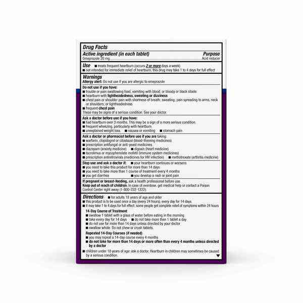 About This Item We aim to show you accurate product information. Manufacturers, suppliers and others provide what you see here, and we have not verified it. See our disclaimer COmeprazole Delayed Release Tablets 20 mg, acid reducer, treats frequent heartburn occurring 2 or more days per week. The active ingredient is omeprazole 20 mg, a Proton Pump Inhibitor (PPI) that deactivates pumps in the stomach lining to inhibit acid production at the source. Taken once every 24 hours for 14 days, Omeprazole Delayed Release Tablets 20 mg is not intended for immediate relief of heartburn and may take 1 to 4 days for full effect. Compare to Prilosec OTC®. Made in Israel. Equate Omeprazole Delayed Release Tablets 20 mg, 42 Ct: EFFECTIVE: Compare Omeprazole Delayed Release Tablets 20 mg to Prilosec OTC®. The active ingredient in these delayed release tablets is Omeprazole 20 mg. It works as an acid reducer to treat frequent heartburn. TREATS FREQUENT HEARTBURN: These acid reducer pills treat frequent heartburn that occurs 2 or more times a week. ACID REDUCER: Omeprazole 20 mg is a Proton Pump Inhibitor (PPI) that deactivates pumps in the stomach lining to inhibit acid production at the source. 14-DAY COURSE OF HEARTBURN TREATMENT: Taken once every 24 hours for 14 days, Omeprazole Delayed Release Tablets 20 mg is not intended for immediate relief of heartburn and may take 1 to 4 days for full effect. DIRECTIONS FOR ACID REDUCER: For adults 18 years of age and older; this product is to be used once a day (every 24 hours), every day for 14 days; it may take 1 to 4 days for full effect; some people get complete relief of symptoms within 24 hours. 14-Day Course of Treatment: swallow 1 tablet with a glass of water before eating in the morning; take every day for 14 days; do not take more than 1 tablet a day; do not use for more than 14 days unless directed by your doctor; swallow whole. Do not chew or crush tablets. Repeated 14-Day Courses (if needed): you may repeat a 14-day course every 4 months; do not take for more than 14 days or more often than every 4 months unless directed by a doctor. Children under 18 years of age: ask a doctor. Heartburn in children may sometimes be caused by a serious condition.