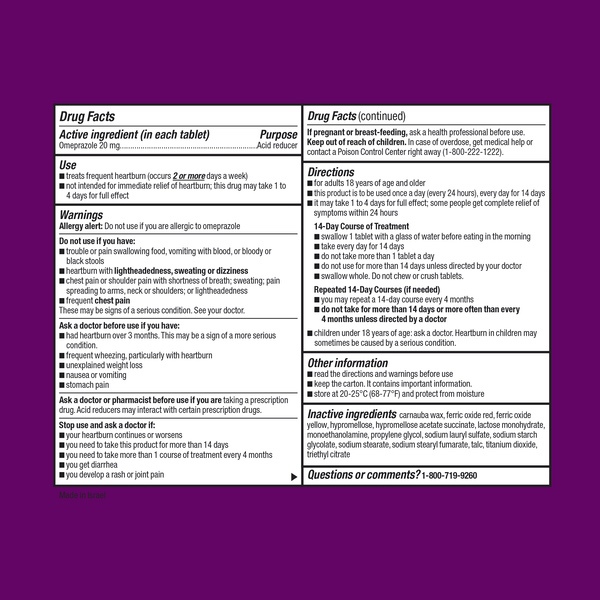 About This Item We aim to show you accurate product information. Manufacturers, suppliers and others provide what you see here, and we have not verified it. See our disclaimer COmeprazole Delayed Release Tablets 20 mg, acid reducer, treats frequent heartburn occurring 2 or more days per week. The active ingredient is omeprazole 20 mg, a Proton Pump Inhibitor (PPI) that deactivates pumps in the stomach lining to inhibit acid production at the source. Taken once every 24 hours for 14 days, Omeprazole Delayed Release Tablets 20 mg is not intended for immediate relief of heartburn and may take 1 to 4 days for full effect. Compare to Prilosec OTC®. Made in Israel. Equate Omeprazole Delayed Release Tablets 20 mg, 42 Ct: EFFECTIVE: Compare Omeprazole Delayed Release Tablets 20 mg to Prilosec OTC®. The active ingredient in these delayed release tablets is Omeprazole 20 mg. It works as an acid reducer to treat frequent heartburn. TREATS FREQUENT HEARTBURN: These acid reducer pills treat frequent heartburn that occurs 2 or more times a week. ACID REDUCER: Omeprazole 20 mg is a Proton Pump Inhibitor (PPI) that deactivates pumps in the stomach lining to inhibit acid production at the source. 14-DAY COURSE OF HEARTBURN TREATMENT: Taken once every 24 hours for 14 days, Omeprazole Delayed Release Tablets 20 mg is not intended for immediate relief of heartburn and may take 1 to 4 days for full effect. DIRECTIONS FOR ACID REDUCER: For adults 18 years of age and older; this product is to be used once a day (every 24 hours), every day for 14 days; it may take 1 to 4 days for full effect; some people get complete relief of symptoms within 24 hours. 14-Day Course of Treatment: swallow 1 tablet with a glass of water before eating in the morning; take every day for 14 days; do not take more than 1 tablet a day; do not use for more than 14 days unless directed by your doctor; swallow whole. Do not chew or crush tablets. Repeated 14-Day Courses (if needed): you may repeat a 14-day course every 4 months; do not take for more than 14 days or more often than every 4 months unless directed by a doctor. Children under 18 years of age: ask a doctor. Heartburn in children may sometimes be caused by a serious condition.